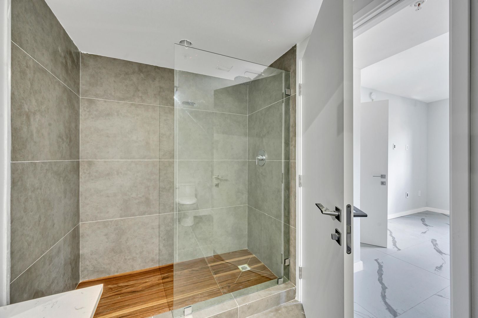 - Sleek quartz countertops, frameless glass showers, and rain showerheads in Bathrooms